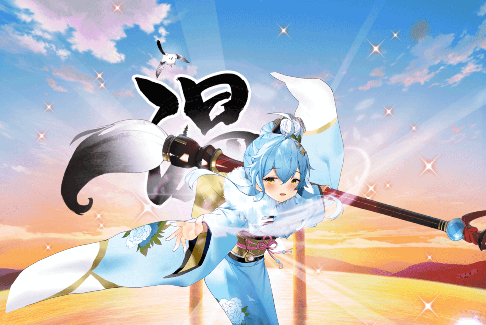 むしろ今が本性表したという可能性の方が……? ついてきたシマエナガもかわいいですね。あとはキャラクターの武器が筆ということもあって意識的に黒色が差し色として使われてるのが印象的です。髪がまとまってて、普段と違うお団子なのもカワイイ!