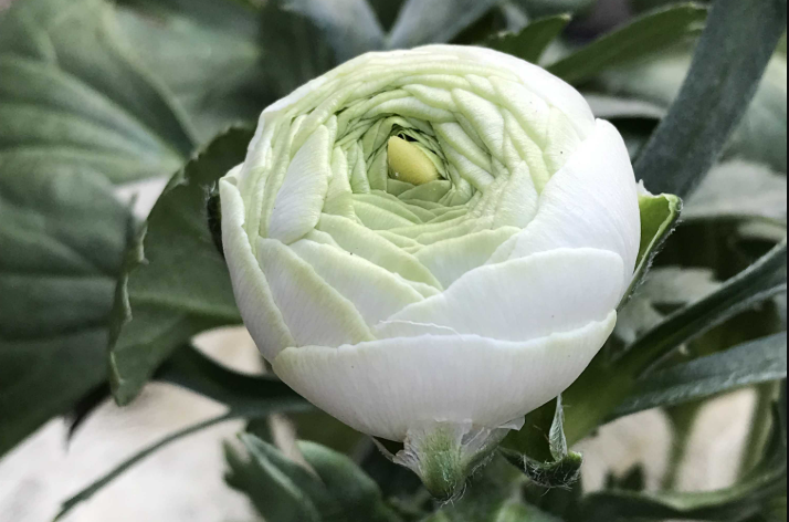 調べてもコレ! という花は見つかりませんでしたが、白バラのつぼみかラナンキュラスのつぼみかと思っています。つぼみであることでまだ幼く、新婚であるナミエルをイメージしているのかもしれません。有識者の情報求む!